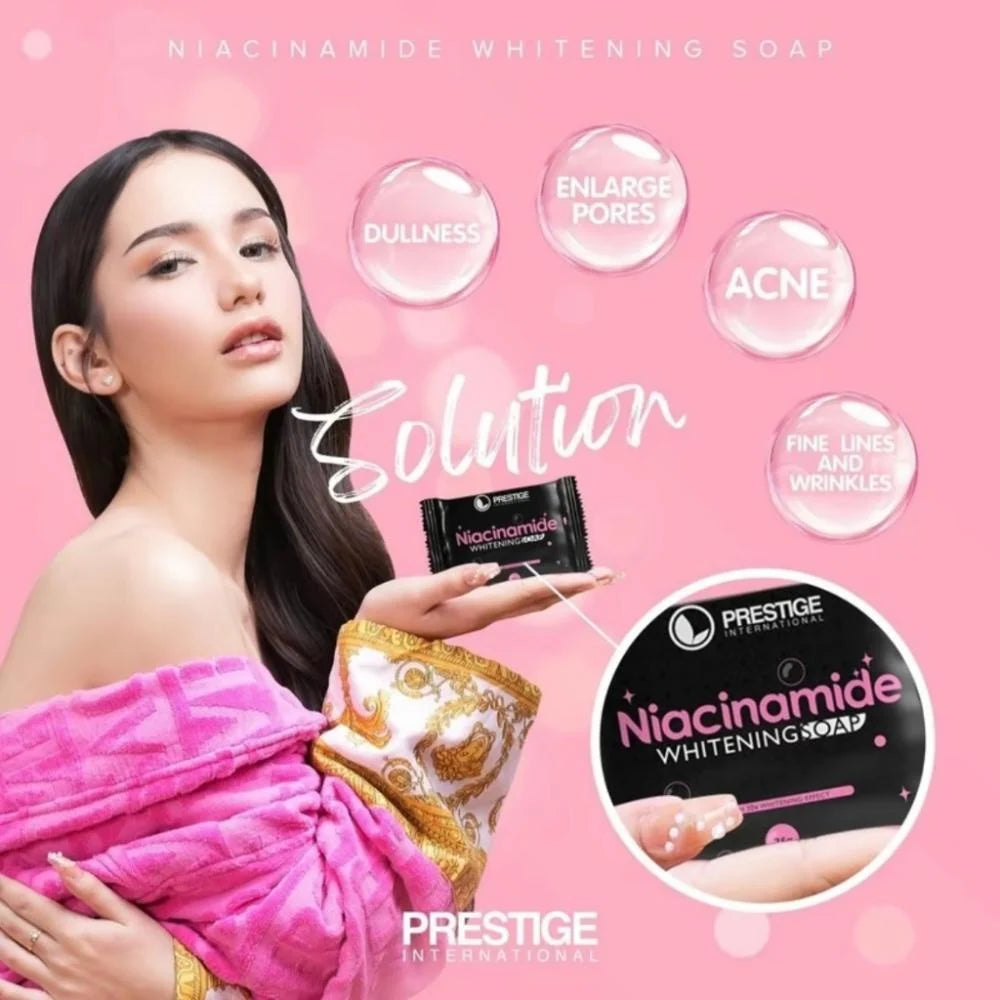 Achieve a radiant, even-toned complexion with Prestige International Whitening Soap! Specially formulated with Niacinamide, this premium soap gently cleanses while brightening the skin, making it ideal for both face and body.